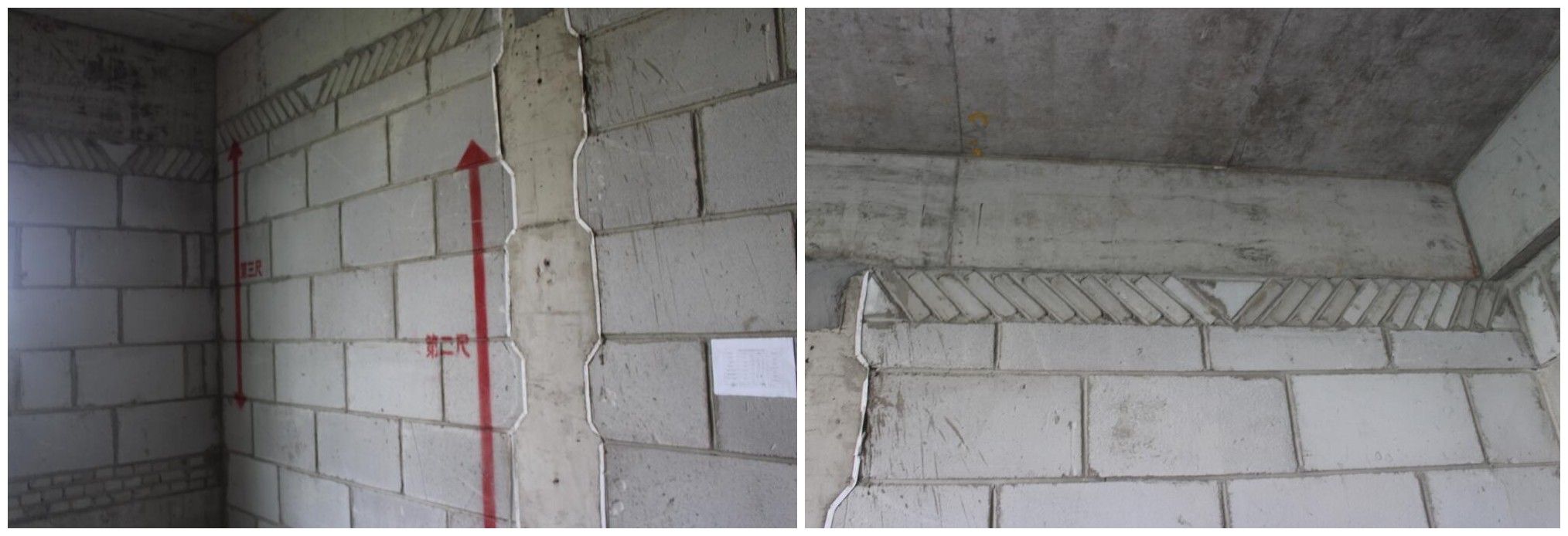 磚砌體及二次結(jié)構(gòu):1、灰縫均勻、密實(shí)、光滑;2、馬牙槎呈45度,邊口粘貼雙面膠,且二次結(jié)構(gòu)混凝土結(jié)口密實(shí),無蜂窩麻面,無漏漿現(xiàn)象;3、頂部斜砌體灰縫密實(shí),角度合乎規(guī)范要求(45度-60度);斜砌體交接處用三角砌體砌筑,使結(jié)構(gòu)穩(wěn)定,起到防裂作用。4、墻體垂直、平整度合規(guī),排版放樣合規(guī);
