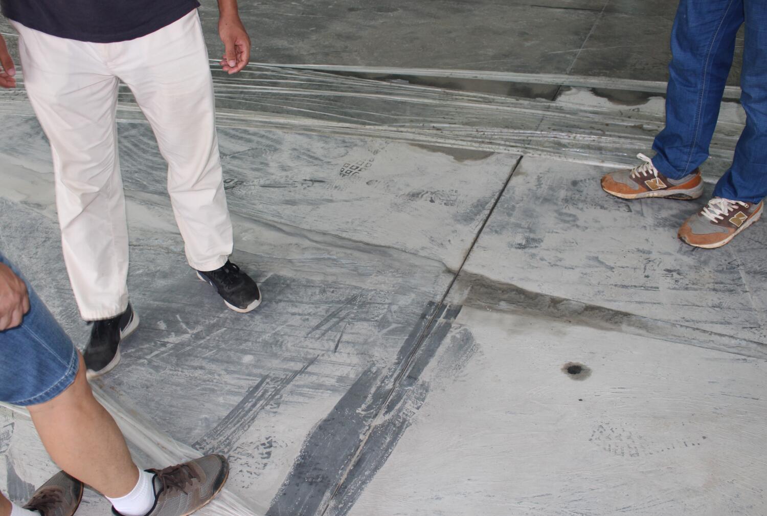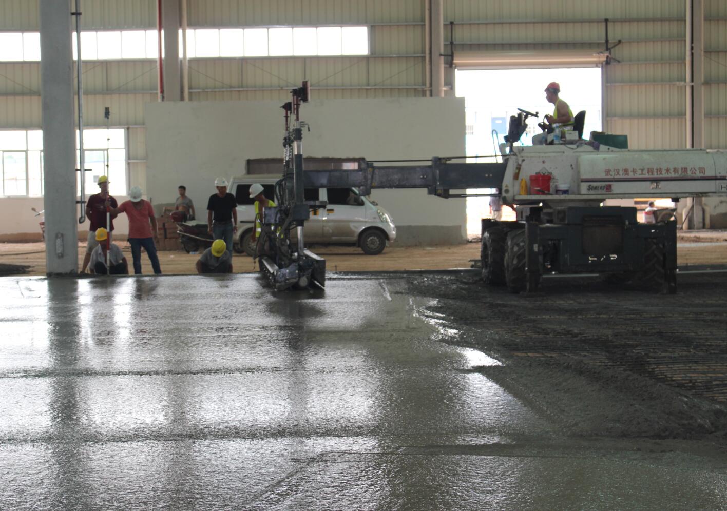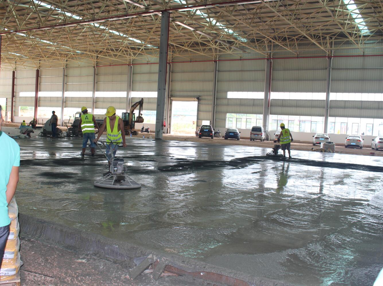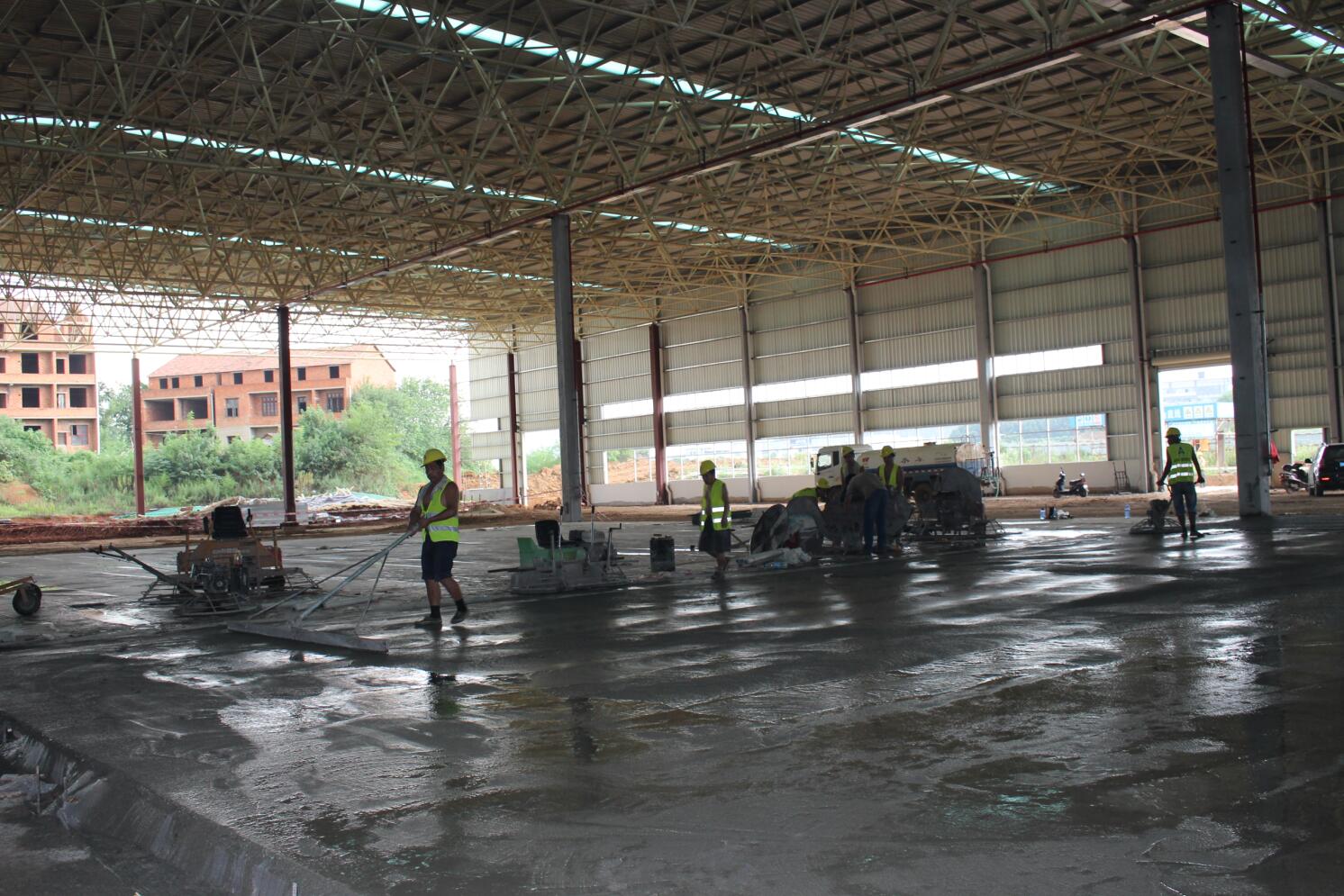 億和中建鋼構(gòu)項目率先在地平混凝土現(xiàn)場引進激光振坪儀和磨光機,不僅在效率上大大縮短了施工時間,降低了人工成本,更是在效果上達到了比人工更為精準的技藝——混凝土的平整度、密實度、觀感度以及面層金剛砂顆粒分布度優(yōu)良,高低差控制在3~4mm。