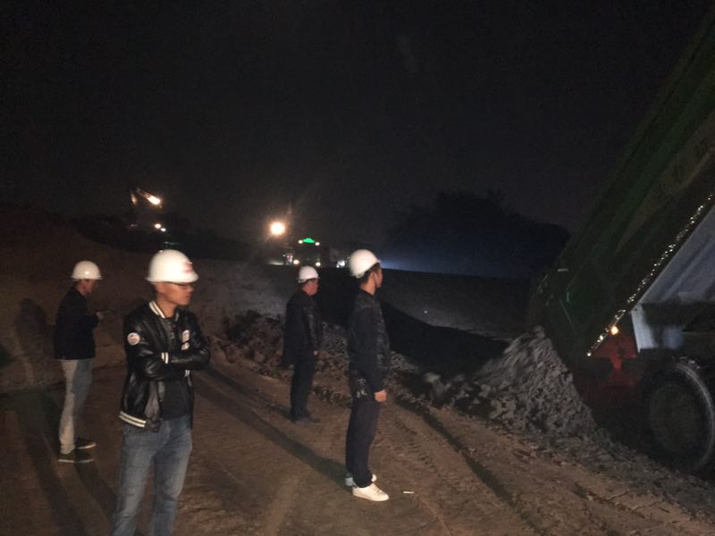 明亮的探照燈刺破黑暗的夜瓊,開辟出一片亮色。亮光里,絡繹不絕的車輛安靜行進,相隔不遠的施工人員有序指揮,裝載,回填,推土、碾壓,所有的工序有條不紊,一條寬闊的路基漸漸成型!