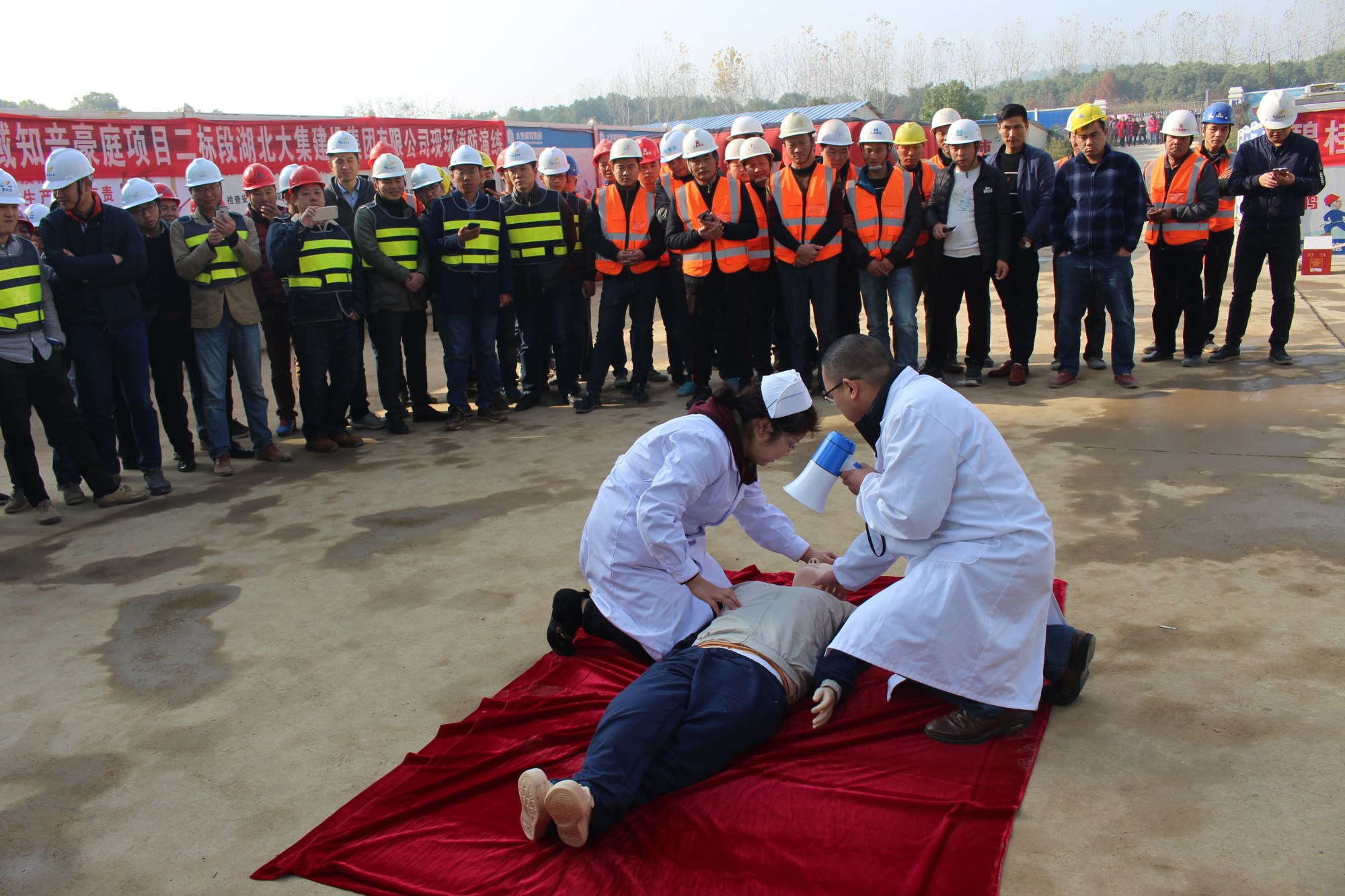 本次演習(xí)的第一個項目是心肺復(fù)蘇,由蔡甸區(qū)大集街衛(wèi)生院為現(xiàn)場參與人員講解,衛(wèi)生院醫(yī)生借助假人模型,生動形象地為大家講解了如何在現(xiàn)場進(jìn)行心肺復(fù)蘇,強調(diào)了心肺復(fù)蘇的方法及要點。大家興趣濃厚,聽得認(rèn)真,看得仔細(xì),將 “心肺復(fù)蘇”要領(lǐng)熟記于心。講解結(jié)束后,衛(wèi)生院醫(yī)護(hù)人員還手把手指導(dǎo)大家進(jìn)行實際操作,糾正錯誤的操作,并給予說明、講解和正確的示范。