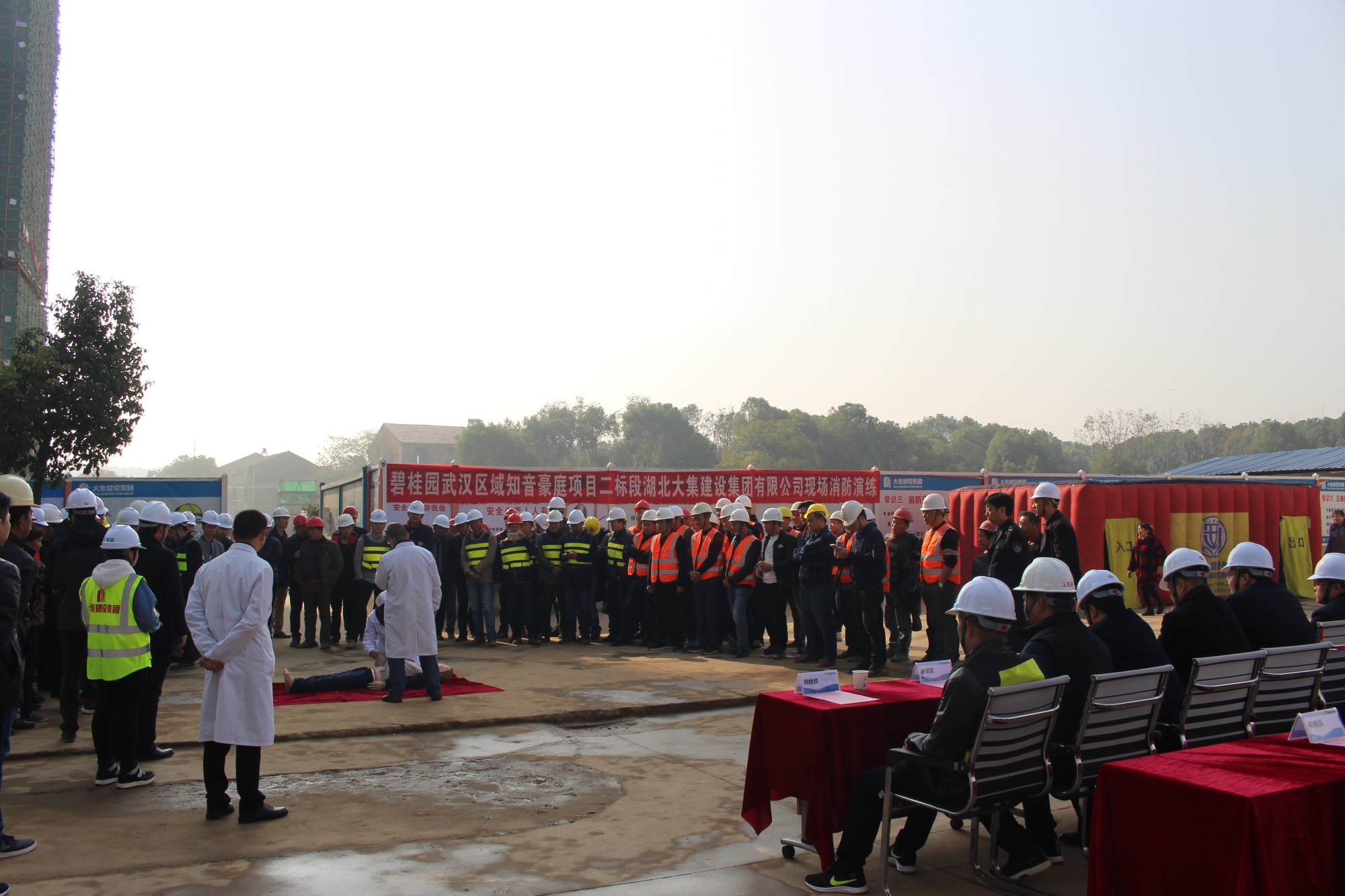 蔡甸區(qū)建管站石進(jìn)洲書記、周波站長、范真科長、宋樹兵科長,蔡甸區(qū)大集街道周修超主任,碧桂園武漢區(qū)域漢口片區(qū)執(zhí)行總裁屈宇宏、武昌片區(qū)執(zhí)行副總裁鄢瑞林、工程管理部副總經(jīng)理葛志鵬、安全管理部副總經(jīng)理吳家應(yīng)、知音豪庭項目副總經(jīng)理馮俊林,湖北大集建設(shè)集團(tuán)副總經(jīng)理徐家富等出席參加了此次消防演習(xí)活動。