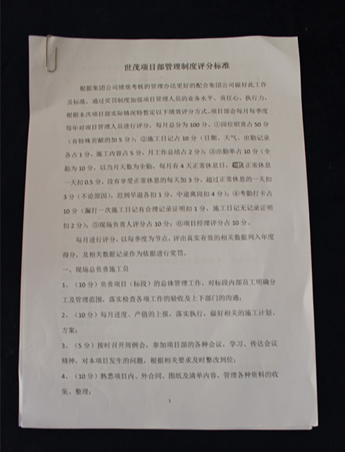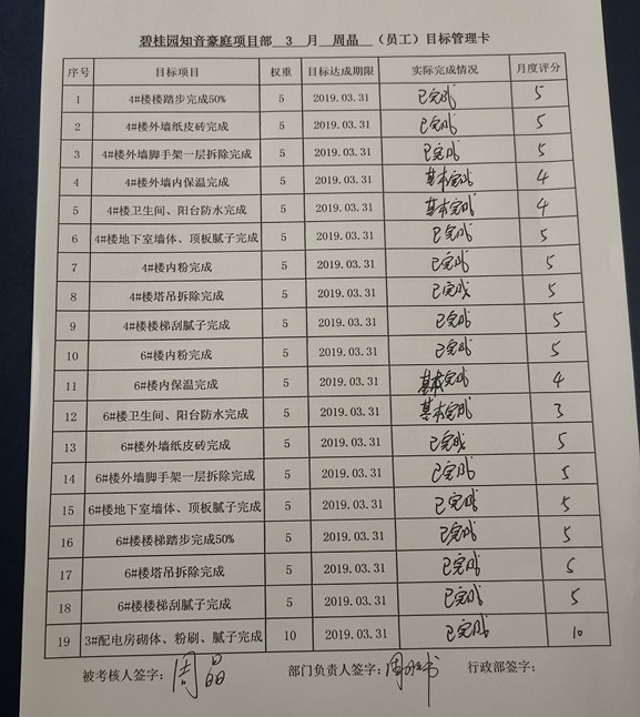 目前,集團實施的項目績效考核制度是今年2月份修訂完善后發(fā)布的,該制度新增了垂直管理環(huán)節(jié),將項目部相關(guān)崗位納入集團統(tǒng)一管理,同時通過《員工目標(biāo)管理卡》將項目月度目標(biāo)分解到每位項目人員頭上,使項目人員更加深刻的明確自身崗位職責(zé),從而真正實現(xiàn)目標(biāo)責(zé)任到人。