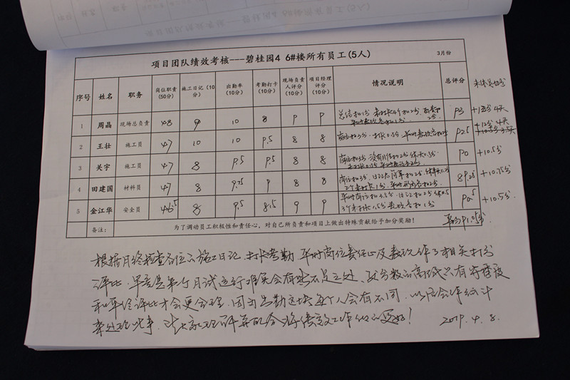 新版項目績效考核制度發(fā)布后,項目經(jīng)理周勝書立即組織自己帶領(lǐng)的項目成員對考核制度進行集中學(xué)習(xí),讓項目人員全面了解制度內(nèi)容。此外,周經(jīng)理還深入研究考核指標(biāo)及內(nèi)容,并以其為標(biāo)準(zhǔn),結(jié)合自身項目的實際情況制定了項目團隊績效考核表,從崗位職責(zé)、考勤打卡、施工日記、團隊配合等方面對項目人員進行考核,并讓項目員工嚴(yán)格執(zhí)行目標(biāo)管理卡,對當(dāng)月的工作任務(wù)進行量化,確保項目人員工作時有目標(biāo)、有責(zé)任、有動力。