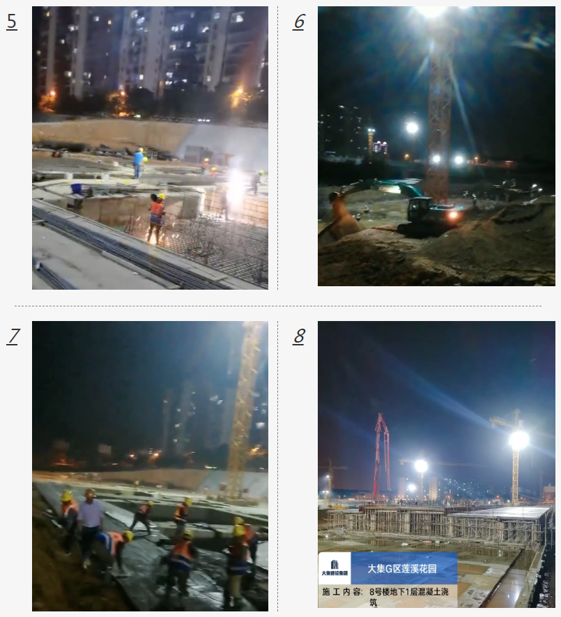在項(xiàng)目部全體員工上下一心、團(tuán)結(jié)一致的沖刺下,施工現(xiàn)場(chǎng)呈現(xiàn)一片熱火朝天、緊張繁忙的景象:白天,挖機(jī)不停地鏟土、運(yùn)土,運(yùn)輸車輛不斷地往來運(yùn)輸,塔吊不停揮舞著“鐵臂”,施工人員分布在工地各個(gè)角落,緊張有序地忙碌著;深夜,工地上依舊燈火通明,機(jī)械聲不斷,夜間氣溫雖比白天低了一些,但汗水仍舊濕透了施工人員們的衣背。