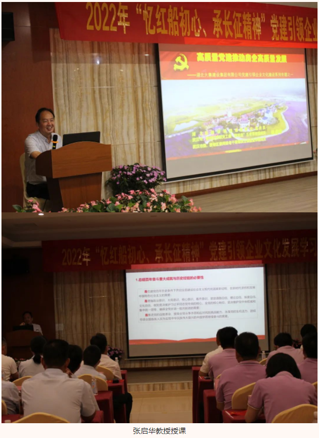 接著,湖北省委講師團(tuán)基層理論宣講員張啟華教授以“高質(zhì)量黨建推動(dòng)企業(yè)高質(zhì)量發(fā)展”為主題進(jìn)行授課。張教授從“苦難與輝煌”、“消失與崛起”、“巨變與挑戰(zhàn)”、“經(jīng)驗(yàn)與啟示”、“輝煌與蝶變”五個(gè)方面分別講述了中國(guó)共產(chǎn)黨的百年奮斗史、跌宕起伏中國(guó)房企十年之變、房企掌舵者眼中的2022年、紐約灣區(qū)發(fā)展成為世界級(jí)灣區(qū)的原因以及高科技贏在新時(shí)代的內(nèi)容,并在講解中融入了湖北大集建設(shè)集團(tuán)和武漢閱景匯兩家公司的發(fā)展歷程,讓大家對(duì)中國(guó)共產(chǎn)黨的發(fā)展、公司的發(fā)展以及個(gè)人的發(fā)展有了更加清晰的認(rèn)識(shí)以及深刻的反思。