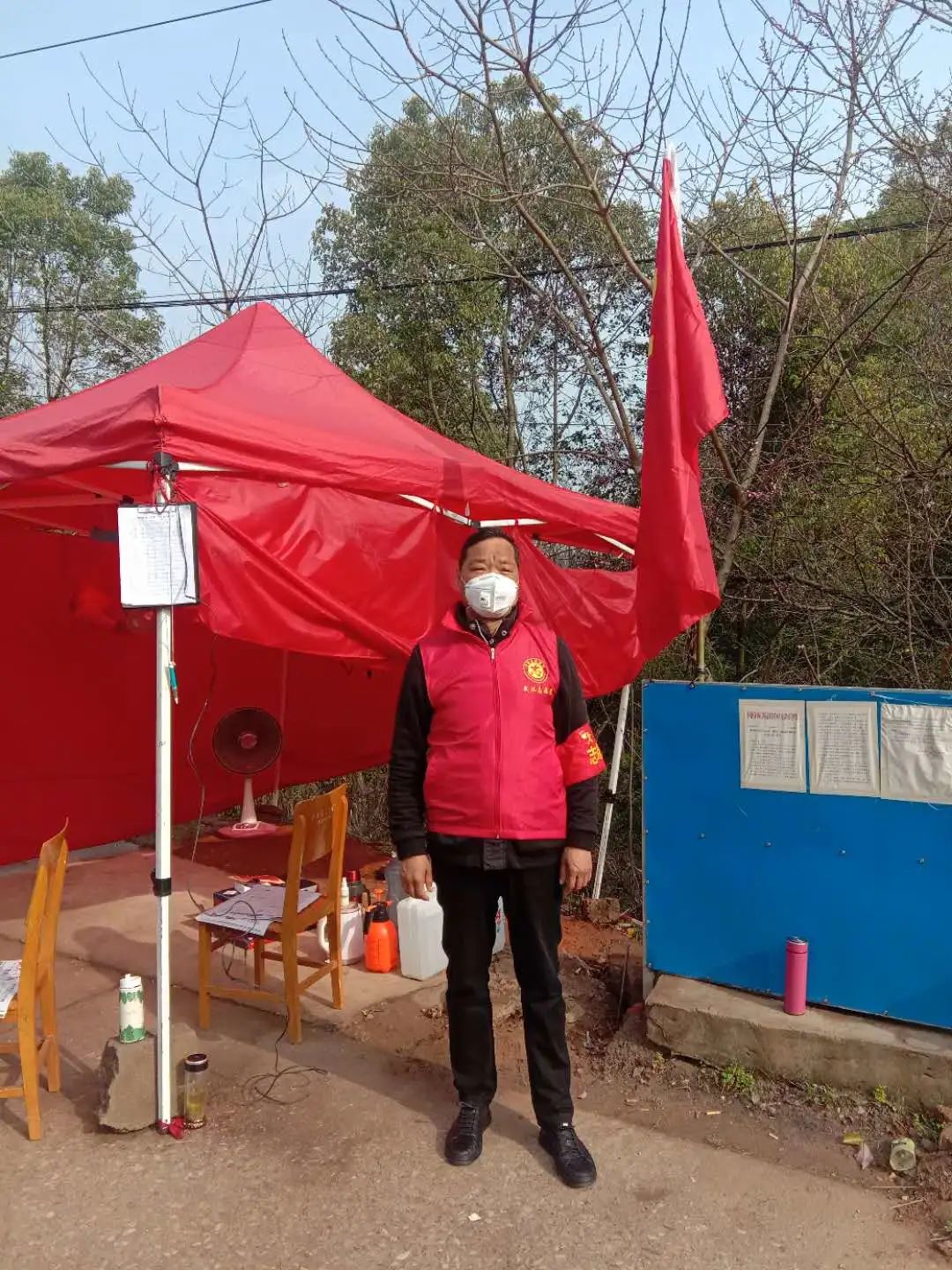 一個紅馬甲,一個紅袖章,一個口罩,57歲的集團(tuán)公司副總經(jīng)理徐家富作為志愿者已經(jīng)在這個平凡的小卡點堅持了許多天。在這里,他也與武漢市數(shù)萬名志愿者一樣,做著平凡但重要的工作,檢查進(jìn)出人員、車輛的通行手續(xù),測量體溫,配合村里分發(fā)搬運物資,為百姓搭建起安全的防護(hù)通道和物資運送通道。簡陋的卡點帳篷里除了消毒防護(hù)用品外,取暖的器材只有一個電烤扇,而武漢的氣溫僅在這一周,上下跳躍的平均溫差就超過十幾度,而這一切距離他剛剛做過的膽部大型手術(shù)僅僅過去了半年。