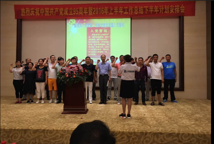 隨著一曲大合唱《沒有共產(chǎn)黨就沒有新中國》,拉開了會(huì)議的序幕。在中國共產(chǎn)黨95周年華誕之際,熱烈祝賀我們黨永葆青春!我們的國家繁榮昌盛!公司黨委組織了新黨員宣誓,重溫了入黨誓詞,充分表達(dá)了對(duì)我黨的熱愛之情。