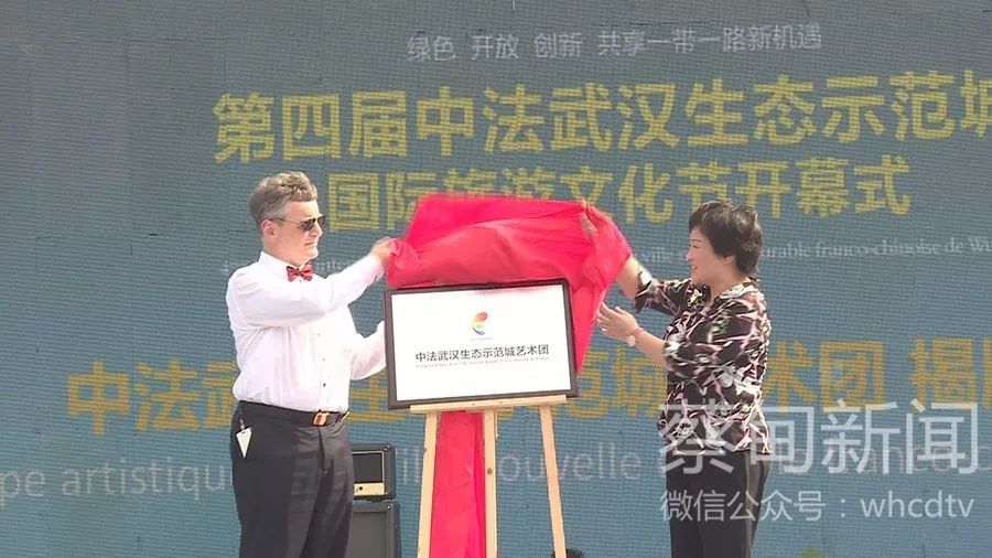 蔡甸區(qū)長(zhǎng)、中法武漢生態(tài)示范城管委會(huì)第一副主任彭巧娣與法國(guó)駐漢總領(lǐng)事貴永華為“中法武漢生態(tài)示范城藝術(shù)團(tuán)”揭牌。