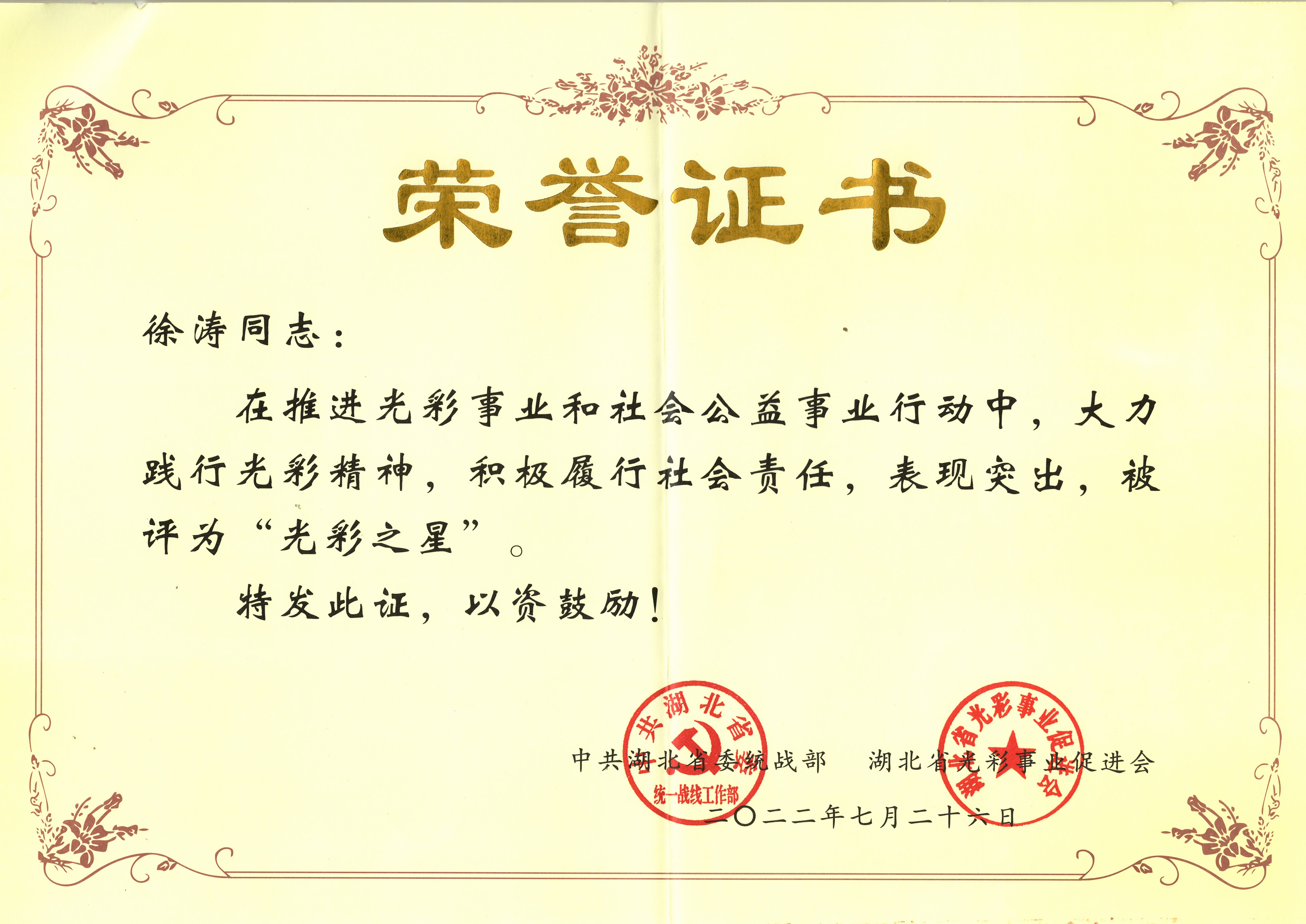 近日,由中共湖北省委統(tǒng)戰(zhàn)部、省光彩事業(yè)促進(jìn)會(huì)共同評(píng)選60名民營經(jīng)濟(jì)人士“光彩之星”表彰會(huì)在恩施召開。會(huì)議表彰了一批熱心公益事業(yè)、積極回報(bào)社會(huì)的優(yōu)秀非公有制經(jīng)濟(jì)人士,湖北大集建設(shè)集團(tuán)有限公司董事長、武漢閱景匯投資發(fā)展有限公司董事長徐濤榮獲全省“光彩之星”榮譽(yù)稱號(hào)!